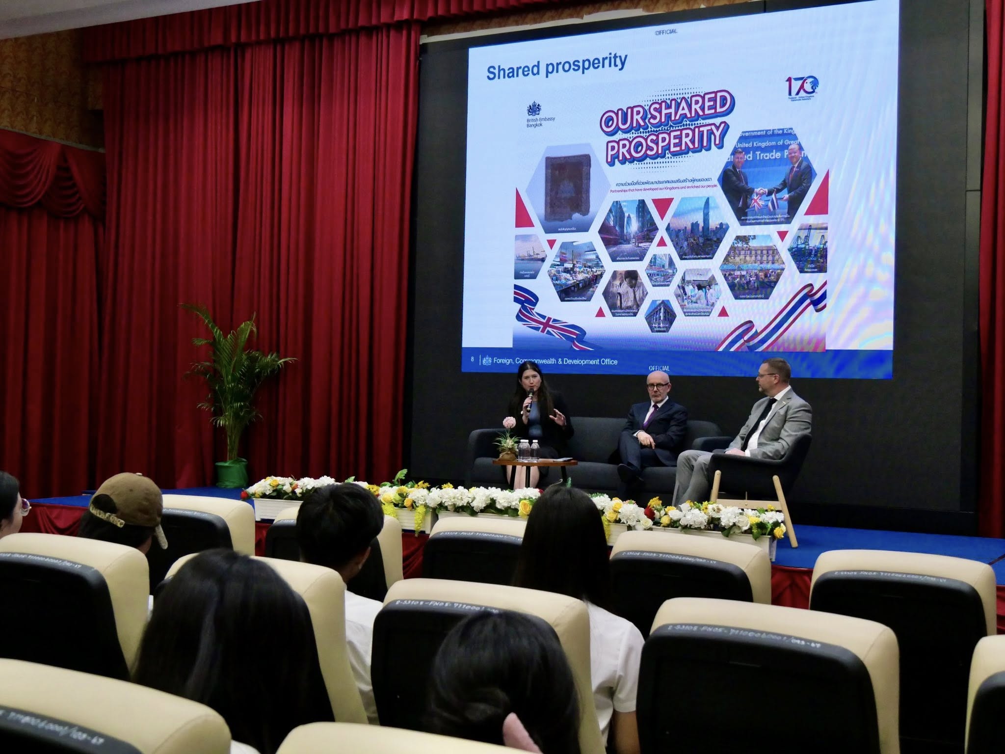 นอกจากนี้ ในช่วงเวลา 14:40 - 15:00 น. ได้มีการจัดกิจกรรมพิเศษสำหรับนิสิตจำนวนประมาณ 30 คน โดยเปิดโอกาสให้นิสิตเข้าร่วมรับฟังการบรรยายสั้นๆ เกี่ยวกับความสัมพันธ์และความร่วมมือด้านการศึกษาระหว่างไทย-สหราชอาณาจักร พร้อมทั้งมีช่วงถาม-ตอบ (Q&A) ที่นิสิตสามารถพบปะพูดคุยกับผู้แทนโดยตรง เพื่อสอบถามข้อมูลเชิงลึกเกี่ยวกับโอกาสในการเดินทางไปศึกษาต่อ ณ ประเทศอังกฤษ รวมถึงรายละเอียดของทุนการศึกษาที่เกี่ยวข้อง ซึ่งถือเป็นการเปิดโลกทัศน์และสร้างแรงบันดาลใจด้านการศึกษาต่อต่างประเทศให้กับนิสิตอย่างเป็นรูปธรรม